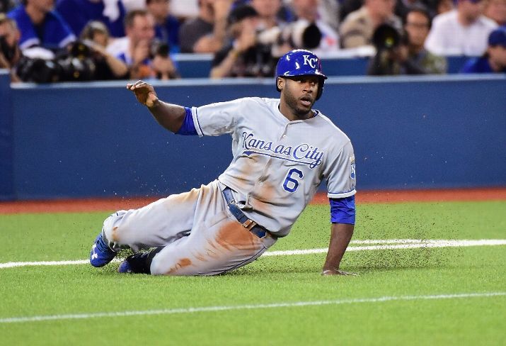 TORONTO, ON - OCTOBER 20: Lorenzo Cain #6 of the Kansas City Royals falls to the turf as he runs around third base in the first inning against the Toronto Blue Jays during game four of the American League Championship Series at Rogers Centre on October 20, 2015 in Toronto, Canada. (Photo by Harry How/Getty Images)