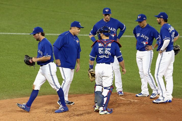 TORONTO, ON - OCTOBER 20: R.A. Dickey #43 of the Toronto Blue Jays is relieved in the second inning against the Kansas City Royals during game four of the American League Championship Series at Rogers Centre on October 20, 2015 in Toronto, Canada. (Photo by Vaughn Ridley/Getty Images)