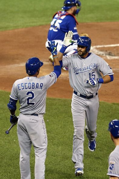 TORONTO, ON - OCTOBER 20: Alex Rios #15 of the Kansas City Royals celebrates with Alcides Escobar #2 of the Kansas City Royals after hitting a solo home run in the second inning against the Toronto Blue Jays during game four of the American League Championship Series at Rogers Centre on October 20, 2015 in Toronto, Canada. (Photo by Vaughn Ridley/Getty Images)