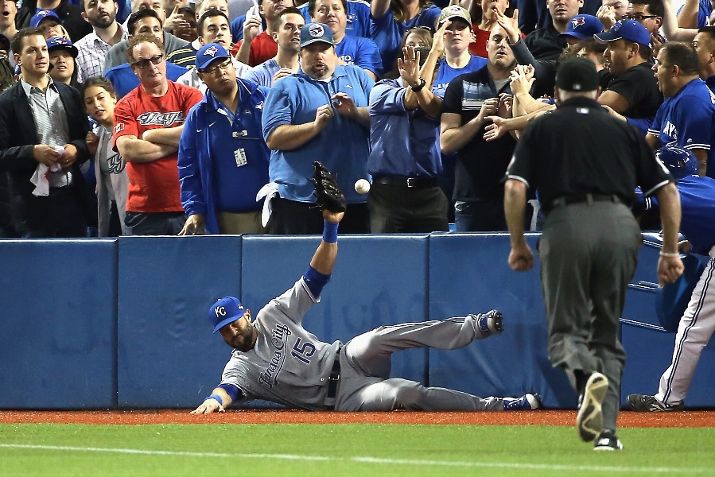 TORONTO, ON - OCTOBER 20: Alex Rios #15 of the Kansas City Royals is unable to catch a foul ball in the third inning against the Toronto Blue Jays during game four of the American League Championship Series at Rogers Centre on October 20, 2015 in Toronto, Canada. (Photo by Tom Szczerbowski/Getty Images) *** BESTPIX ***