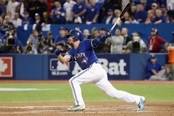 TORONTO, ON - OCTOBER 20: Josh Donaldson #20 of the Toronto Blue Jays hits a ground rule double to score Ryan Goins #17 of the Toronto Blue Jays (not pictured) in the third inning against the Kansas City Royals during game four of the American League Championship Series at Rogers Centre on October 20, 2015 in Toronto, Canada. (Photo by Tom Szczerbowski/Getty Images)