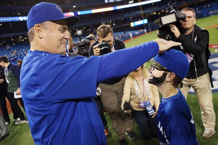 TORONTO, ON - OCTOBER 20: Manager John Gibbons #5 of the Toronto Blue Jays greets a young fan prior to game four of the American League Championship Series between the Toronto Blue Jays and the Kansas City Royals at Rogers Centre on October 20, 2015 in Toronto, Canada. (Photo by Vaughn Ridley/Getty Images)