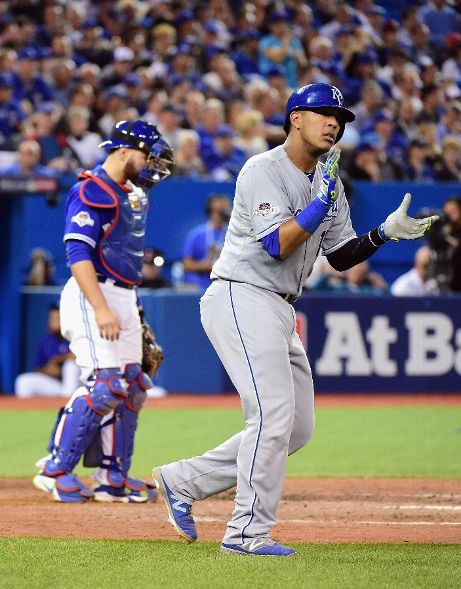 TORONTO, ON - OCTOBER 20: Salvador Perez #13 of the Kansas City Royals reacts after scoring a run in the seventh inning against the Toronto Blue Jays during game four of the American League Championship Series at Rogers Centre on October 20, 2015 in Toronto, Canada. (Photo by Harry How/Getty Images)