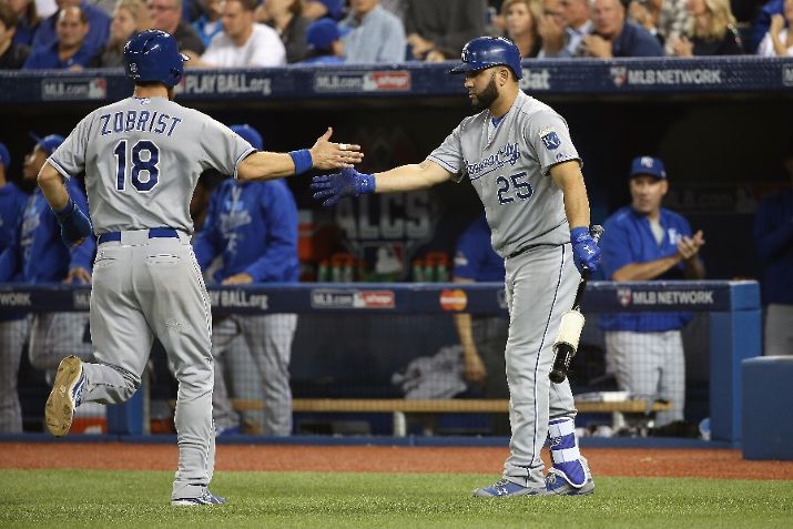 TORONTO, ON - OCTOBER 20: Ben Zobrist #18 of the Kansas City Royals celebrates with Kendrys Morales #25 of the Kansas City Royals after scoring a run in the seventh inning against the Toronto Blue Jays during game four of the American League Championship Series at Rogers Centre on October 20, 2015 in Toronto, Canada. (Photo by Tom Szczerbowski/Getty Images)