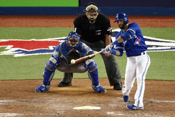 TORONTO, ON - OCTOBER 20: Jose Bautista #19 of the Toronto Blue Jays hits a single in the sixth inning against the Kansas City Royals during game four of the American League Championship Series at Rogers Centre on October 20, 2015 in Toronto, Canada. (Photo by Vaughn Ridley/Getty Images)