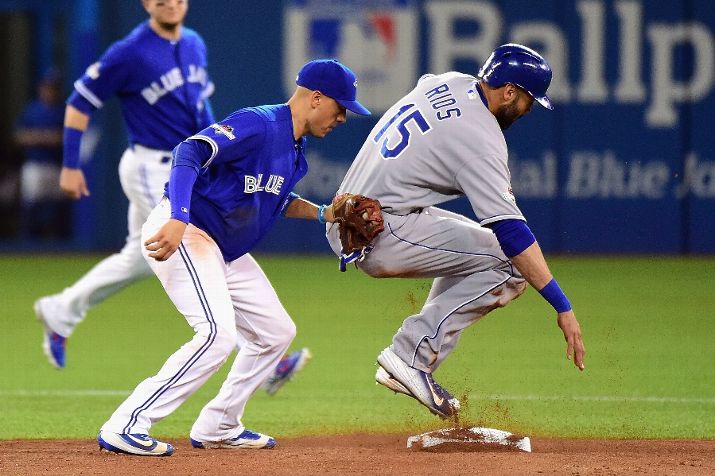 TORONTO, ON - OCTOBER 20: Alex Rios #15 of the Kansas City Royals is tagged out by Ryan Goins #17 of the Toronto Blue Jays as he attempts to steal second base in the fourth inning during game four of the American League Championship Series between the Toronto Blue Jays and the Kansas City Royals at Rogers Centre on October 20, 2015 in Toronto, Canada. Rios was called safe, but the call was overturned upon review. (Photo by Harry How/Getty Images) *** BESTPIX ***