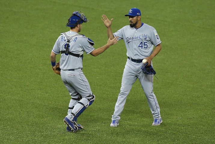 TORONTO, ON - OCTOBER 20: Drew Butera #9 of the Kansas City Royals and Franklin Morales #45 of the Kansas City Royals celebrate defeating the Toronto Blue Jays 14-2 in game four of the American League Championship Series at Rogers Centre on October 20, 2015 in Toronto, Canada. (Photo by Vaughn Ridley/Getty Images)