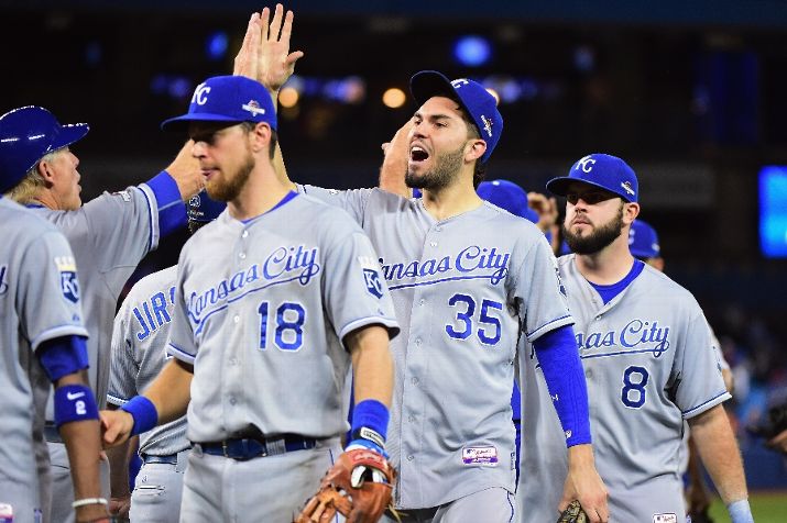 TORONTO, ON - OCTOBER 20: Eric Hosmer #35 of the Kansas City Royals reacts to a 14-2 win over the Toronto Blue Jays with Ben Zobrist #18 and Mike Moustakas #8 during game four of the American League Championship Series at Rogers Centre on October 20, 2015 in Toronto, Canada. (Photo by Harry How/Getty Images)