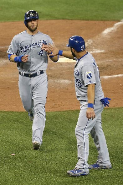 TORONTO, ON - OCTOBER 20: Alex Gordon #4 and Kendrys Morales #25 of the Kansas City Royals score on an Alcides Escobar #2 hit to take a 14-2 lead during the ninth inning during game four of the American League Championship Series at Rogers Centre on October 20, 2015 in Toronto, Canada. (Photo by Vaughn Ridley/Getty Images)