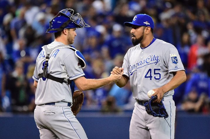 TORONTO, ON - OCTOBER 20: Drew Butera #9 of the Kansas City Royals and Franklin Morales #45 of the Kansas City Royals celebrate defeating the Toronto Blue Jays 14-2 in game four of the American League Championship Series at Rogers Centre on October 20, 2015 in Toronto, Canada. (Photo by Harry How/Getty Images)
