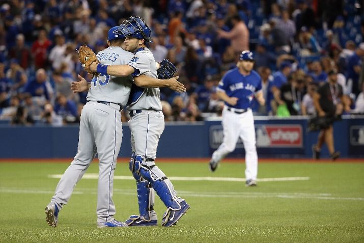 TORONTO, ON - OCTOBER 20: Franklin Morales #45 of the Kansas City Royals and Drew Butera #9 of the Kansas City Royals celebrate defeating the Toronto Blue Jays 14-2 in game four of the American League Championship Series at Rogers Centre on October 20, 2015 in Toronto, Canada. (Photo by Tom Szczerbowski/Getty Images)