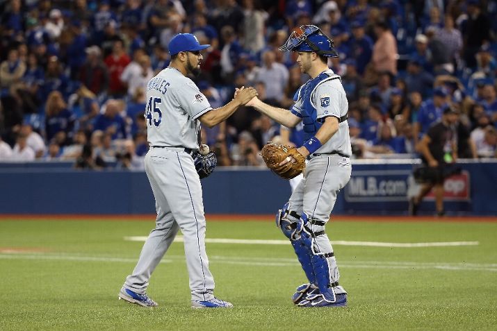 TORONTO, ON - OCTOBER 20: Franklin Morales #45 of the Kansas City Royals and Drew Butera #9 of the Kansas City Royals celebrate defeating the Toronto Blue Jays 14-2 in game four of the American League Championship Series at Rogers Centre on October 20, 2015 in Toronto, Canada. (Photo by Tom Szczerbowski/Getty Images)