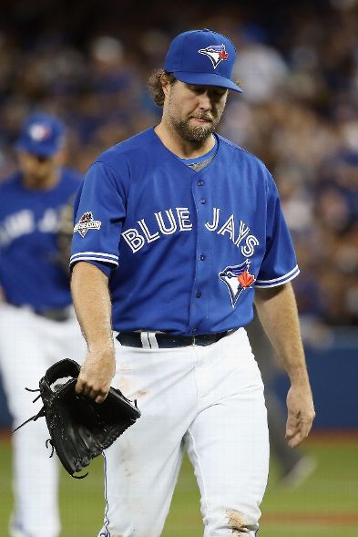 TORONTO, ON - OCTOBER 20: R.A. Dickey #43 of the Toronto Blue Jays reacts as he leaves the game in the second inning against the Kansas City Royals during game four of the American League Championship Series at Rogers Centre on October 20, 2015 in Toronto, Canada. (Photo by Tom Szczerbowski/Getty Images)