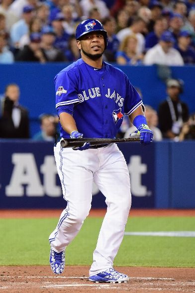 TORONTO, ON - OCTOBER 20: Edwin Encarnacion #10 of the Toronto Blue Jays reacts to his strikeout in the first inning against the Kansas City Royals during game four of the American League Championship Series at Rogers Centre on October 20, 2015 in Toronto, Canada. (Photo by Harry How/Getty Images)