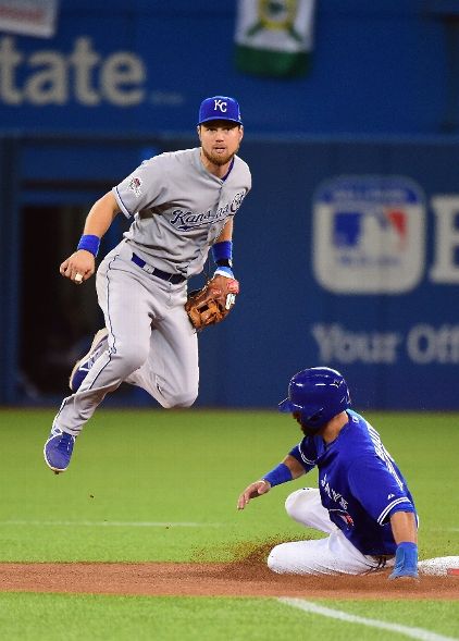 TORONTO, ON - OCTOBER 20: Ben Zobrist #18 of the Kansas City Royals watches his throw over Jose Bautista #19 of the Toronto Blue Jays for a double play in the sixth inning during game four of the American League Championship Series at Rogers Centre on October 20, 2015 in Toronto, Canada. (Photo by Harry How/Getty Images)