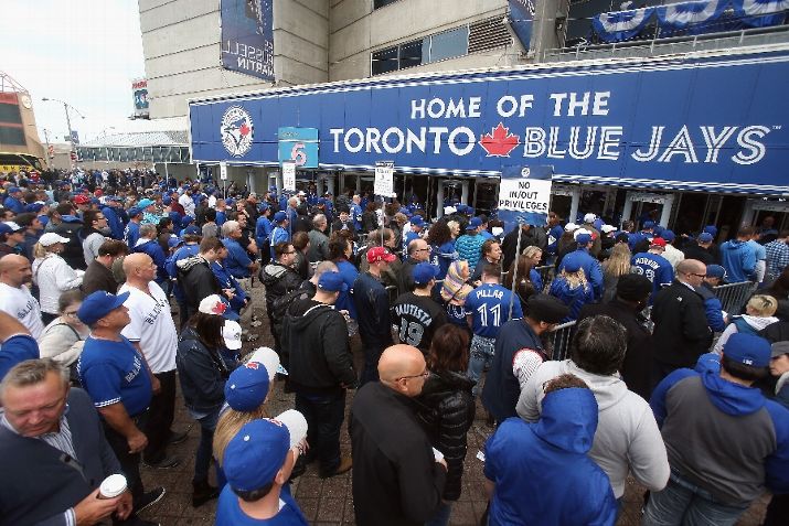 TORONTO, ON - OCTOBER 20: Fans enter the stadium for the game between the Kansas City Royals and the Toronto Blue Jays during game four of the American League Championship Series at Rogers Centre on October 20, 2015 in Toronto, Canada. (Photo by Tom Szczerbowski/Getty Images)