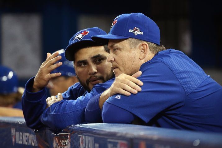 TORONTO, ON - OCTOBER 20: Dioner Navarro #30 of the Toronto Blue Jays talks to manager John Gibbons #5 in a 14-2 loss to the Kansas City Royals during game four of the American League Championship Series at Rogers Centre on October 20, 2015 in Toronto, Canada. (Photo by Tom Szczerbowski/Getty Images)