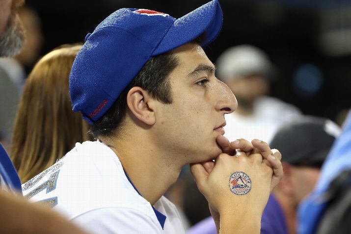 TORONTO, ON - OCTOBER 20: A fan reacts during a 14-2 Kansas City Royals win over the Toronto Blue Jays during game four of the American League Championship Series at Rogers Centre on October 20, 2015 in Toronto, Canada. (Photo by Tom Szczerbowski/Getty Images)