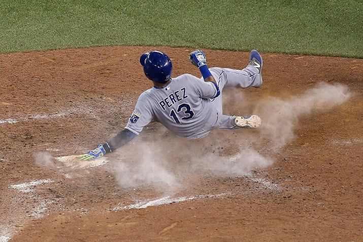 TORONTO, ON - OCTOBER 20: Salvador Perez #13 of the Kansas City Royals scores a run in the eighth inning against the Toronto Blue Jays during game four of the American League Championship Series at Rogers Centre on October 20, 2015 in Toronto, Canada. (Photo by Tom Szczerbowski/Getty Images)