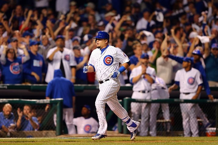 CHICAGO, IL - OCTOBER 20: Kyle Schwarber #12 of the Chicago Cubs rounds the bases after hitting a solo home run in the first inning against Jacob deGrom #48 of the New York Mets during game three of the 2015 MLB National League Championship Series at Wrigley Field on October 20, 2015 in Chicago, Illinois. (Photo by Elsa/Getty Images)