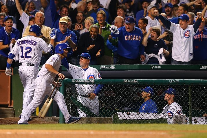 CHICAGO, IL - OCTOBER 20: Kyle Schwarber #12 of the Chicago Cubs celebrates with manager Joe Maddon #70 after hitting a solo home run in the first inning against Jacob deGrom #48 of the New York Mets during game three of the 2015 MLB National League Championship Series at Wrigley Field on October 20, 2015 in Chicago, Illinois. (Photo by Elsa/Getty Images)