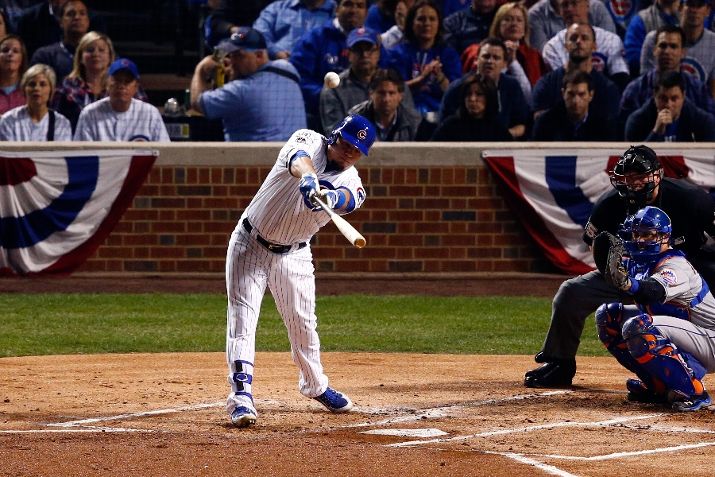 CHICAGO, IL - OCTOBER 20: Kyle Schwarber #12 of the Chicago Cubs hits a solo home run in the first inning against Jacob deGrom #48 of the New York Mets during game three of the 2015 MLB National League Championship Series at Wrigley Field on October 20, 2015 in Chicago, Illinois. (Photo by David Banks/Getty Images)