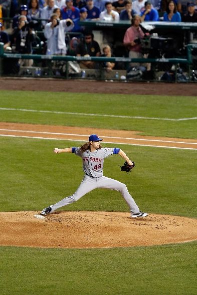 CHICAGO, IL - OCTOBER 20: Jacob deGrom #48 of the New York Mets throws a pitch in the first inning against the Chicago Cubs during game three of the 2015 MLB National League Championship Series at Wrigley Field on October 20, 2015 in Chicago, Illinois. (Photo by Jon Durr/Getty Images)