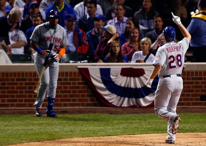 CHICAGO, IL - OCTOBER 20: Daniel Murphy #28 of the New York Mets celebrates after hitting a solo home run in the third inning against Kyle Hendricks #28 of the Chicago Cubs during game three of the 2015 MLB National League Championship Series at Wrigley Field on October 20, 2015 in Chicago, Illinois. (Photo by David Banks/Getty Images)