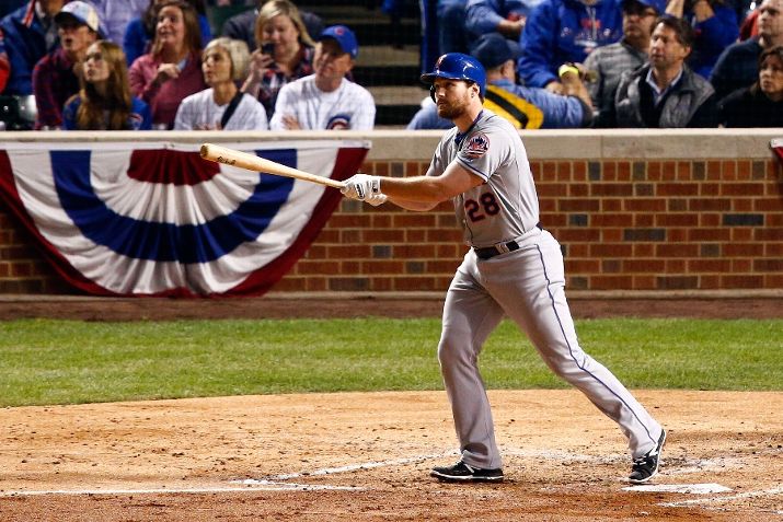 CHICAGO, IL - OCTOBER 20: Daniel Murphy #28 of the New York Mets hits a solo home run in the third inning against Kyle Hendricks #28 of the Chicago Cubs during game three of the 2015 MLB National League Championship Series at Wrigley Field on October 20, 2015 in Chicago, Illinois. (Photo by David Banks/Getty Images)