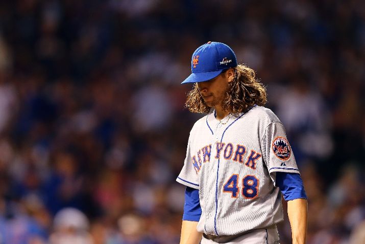 CHICAGO, IL - OCTOBER 20: Jacob deGrom #48 of the New York Mets walks back to the dugout in the fourth inning against the Chicago Cubs during game three of the 2015 MLB National League Championship Series at Wrigley Field on October 20, 2015 in Chicago, Illinois. (Photo by Elsa/Getty Images)