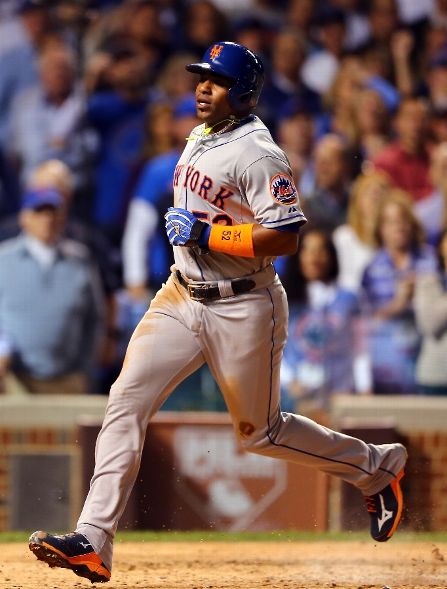 CHICAGO, IL - OCTOBER 20: Yoenis Cespedes #52 of the New York Mets scores a run off of a wild pitch thrown by Trevor Cahill #53 of the Chicago Cubs in the sixth inning during game three of the 2015 MLB National League Championship Series at Wrigley Field on October 20, 2015 in Chicago, Illinois. (Photo by Elsa/Getty Images)
