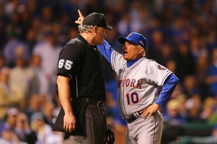 CHICAGO, IL - OCTOBER 20: Terry Collins #10 of the New York Mets argues a ground rule double call with Home Plate Umpire Ted Barrett #65 in the sixth inning against the Chicago Cubs during game three of the 2015 MLB National League Championship Series at Wrigley Field on October 20, 2015 in Chicago, Illinois. (Photo by Elsa/Getty Images)