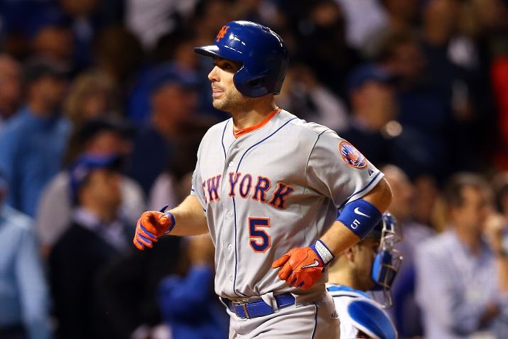 CHICAGO, IL - OCTOBER 20: David Wright #5 of the New York Mets score off of a double hit by Yoenis Cespedes #52 of the New York Mets in the seventh inning against Justin Grimm #52 of the Chicago Cubs during game three of the 2015 MLB National League Championship Series at Wrigley Field on October 20, 2015 in Chicago, Illinois. (Photo by Elsa/Getty Images)