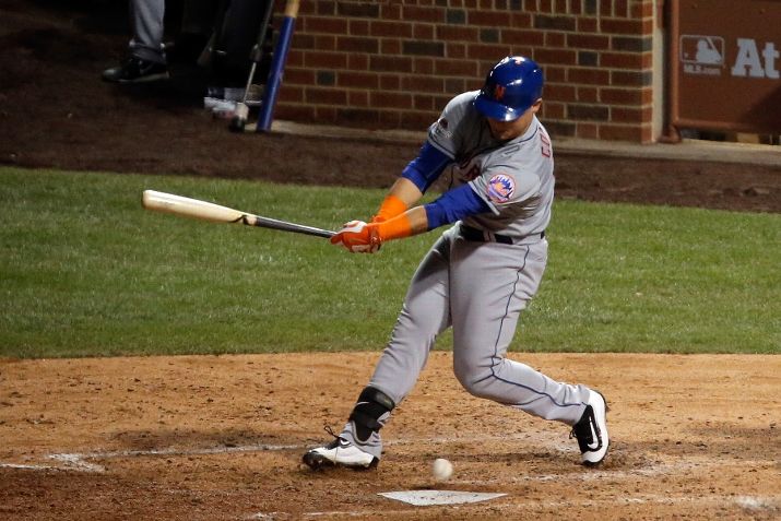CHICAGO, IL - OCTOBER 20: Michael Conforto #30 of the New York Mets strikes out on a wild pitch thrown by Trevor Cahill #53 of the Chicago Cubs in the sixth inning to score Yoenis Cespedes #52 during game three of the 2015 MLB National League Championship Series at Wrigley Field on October 20, 2015 in Chicago, Illinois. (Photo by Jon Durr/Getty Images)