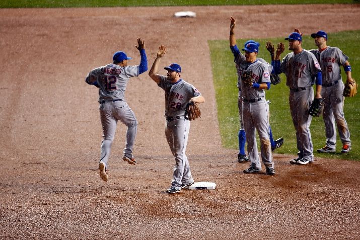 CHICAGO, IL - OCTOBER 20: Daniel Murphy #28 and Juan Lagares #12 of the New York Mets celebrate after defeating the Chicago Cubs in game three of the 2015 MLB National League Championship Series at Wrigley Field on October 20, 2015 in Chicago, Illinois. The Mets defeated the Cubs with a score of 5 to 2. (Photo by David Banks/Getty Images)