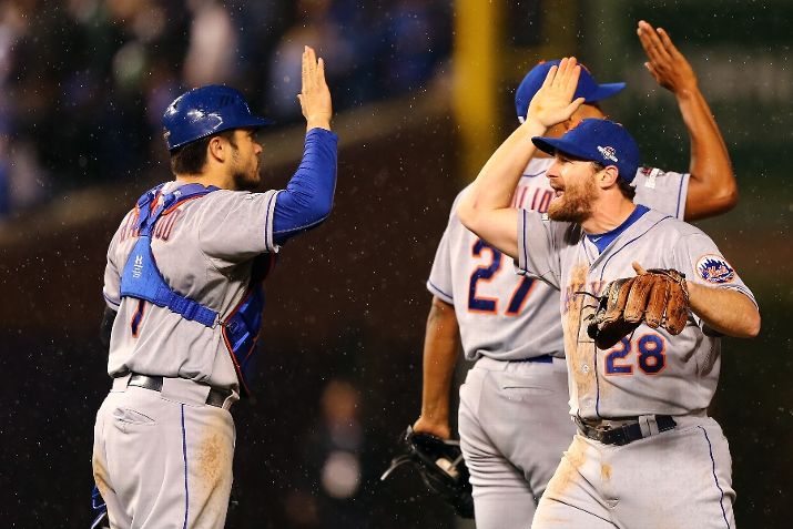 CHICAGO, IL - OCTOBER 20: Daniel Murphy #28 and Travis d'Arnaud #7 of the New York Mets celebrate after defeating the Chicago Cubs in game three of the 2015 MLB National League Championship Series at Wrigley Field on October 20, 2015 in Chicago, Illinois. The Mets defeated the Cubs with a score of 5 to 2. (Photo by Elsa/Getty Images)