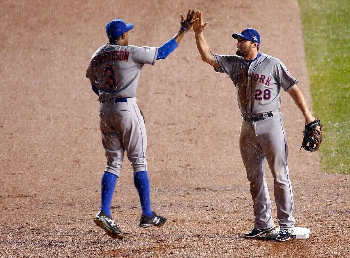 CHICAGO, IL - OCTOBER 20: Daniel Murphy #28 and Curtis Granderson #3 of the New York Mets celebrate after defeating the Chicago Cubs in game three of the 2015 MLB National League Championship Series at Wrigley Field on October 20, 2015 in Chicago, Illinois. The Mets defeated the Cubs with a score of 5 to 2. (Photo by David Banks/Getty Images)