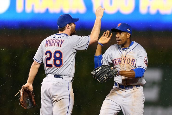 CHICAGO, IL - OCTOBER 20: Daniel Murphy #28 and Curtis Granderson #3 of the New York Mets celebrate after defeating the Chicago Cubs in game three of the 2015 MLB National League Championship Series at Wrigley Field on October 20, 2015 in Chicago, Illinois. The Mets defeated the Cubs with a score of 5 to 2. (Photo by Elsa/Getty Images)