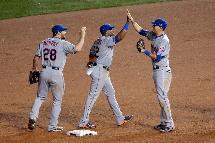 CHICAGO, IL - OCTOBER 20: Daniel Murphy #28, Wilmer Flores #4 and Yoenis Cespedes #52 of the New York Mets celebrate after defeating the Chicago Cubs in game three of the 2015 MLB National League Championship Series at Wrigley Field on October 20, 2015 in Chicago, Illinois. The Mets defeated the Cubs with a score of 5 to 2. (Photo by Jon Durr/Getty Images)