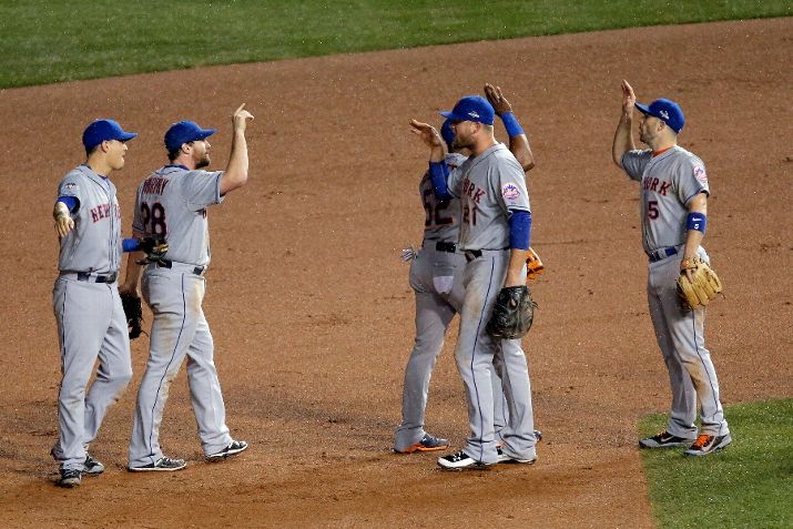 CHICAGO, IL - OCTOBER 20: The New York Mets celebrate after defeating the Chicago Cubs in game three of the 2015 MLB National League Championship Series at Wrigley Field on October 20, 2015 in Chicago, Illinois. The Mets defeated the Cubs with a score of 5 to 2. (Photo by Jon Durr/Getty Images)