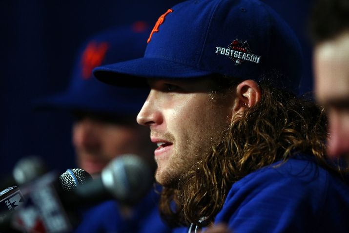 CHICAGO, IL - OCTOBER 20: Jacob deGrom #48 of the New York Mets speaks during a press conference after game three of the 2015 MLB National League Championship Series at Wrigley Field on October 20, 2015 in Chicago, Illinois. The Mets defeated the Cubs with a score of 5 to 2. (Photo by Elsa/Getty Images)