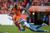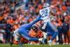 DENVER, CO - DECEMBER 22: Phillip Lindsay #30 of the Denver Broncos is covered by Tavon Wilson #32 of the Detroit Lions on a fourth quarter touchdown run at Empower Field on December 22, 2019 in Denver, Colorado. (Photo by Dustin Bradford/Getty Images)