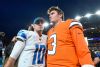 DENVER, CO - DECEMBER 22: Drew Lock #3 of the Denver Broncos and David Blough #10 of the Detroit Lions meet on the field after a 27-17 Denver Broncos win at Empower Field on December 22, 2019 in Denver, Colorado. (Photo by Dustin Bradford/Getty Images)