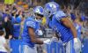 DETROIT, MI - DECEMBER 29: Kerryon Johnson #33 of the Detroit Lions scores a touchdown and celebrates with teammate Jason Cabinda #53 during the second quarter of the game against the Green Bay Packers at Ford Field on December 29, 2019 in Detroit, Michigan. (Photo by Leon Halip/Getty Images)