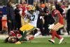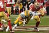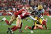 SANTA CLARA, CALIFORNIA - JANUARY 19: Aaron Jones #33 of the Green Bay Packers is tackled by Fred Warner #54 of the San Francisco 49ers during the second half of the NFC Championship game at Levi's Stadium on January 19, 2020 in Santa Clara, California. (Photo by Sean M. Haffey/Getty Images)