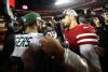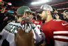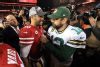 SANTA CLARA, CALIFORNIA - JANUARY 19: Jimmy Garoppolo #10 of the San Francisco 49ers shakes hands with Aaron Rodgers #12 of the Green Bay Packers after winning the NFC Championship game at Levi's Stadium on January 19, 2020 in Santa Clara, California. The 49ers beat the Packers 37-20. (Photo by Sean M. Haffey/Getty Images)