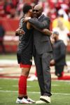 SANTA CLARA, CALIFORNIA - JANUARY 19: NFL Hall of Fame receiver Jerry Rice hugs Kendrick Bourne #84 of the San Francisco 49ers during warm ups prior to their game against the Green Bay Packers in the NFC Championship game at Levi's Stadium on January 19, 2020 in Santa Clara, California. (Photo by Ezra Shaw/Getty Images)