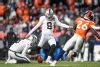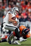DENVER, COLORADO - DECEMBER 29: Derek Carrier #85 of the Oakland Raiders is tackled by Todd Davis #51 of the Denver Broncos in the fourth quarter at Empower Field at Mile High on December 29, 2019 in Denver, Colorado. (Photo by Matthew Stockman/Getty Images)