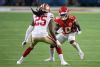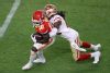 MIAMI, FLORIDA - FEBRUARY 02: Travis Kelce #87 of the Kansas City Chiefs is tackled by Jimmie Ward #20 of the San Francisco 49ers during the fourth quarter in Super Bowl LIV at Hard Rock Stadium on February 02, 2020 in Miami, Florida. (Photo by Al Bello/Getty Images)