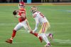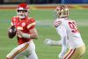MIAMI, FLORIDA - FEBRUARY 02: Patrick Mahomes #15 of the Kansas City Chiefs scrambles away from Arik Armstead #91 of the San Francisco 49ers in Super Bowl LIV at Hard Rock Stadium on February 02, 2020 in Miami, Florida. (Photo by Al Bello/Getty Images)